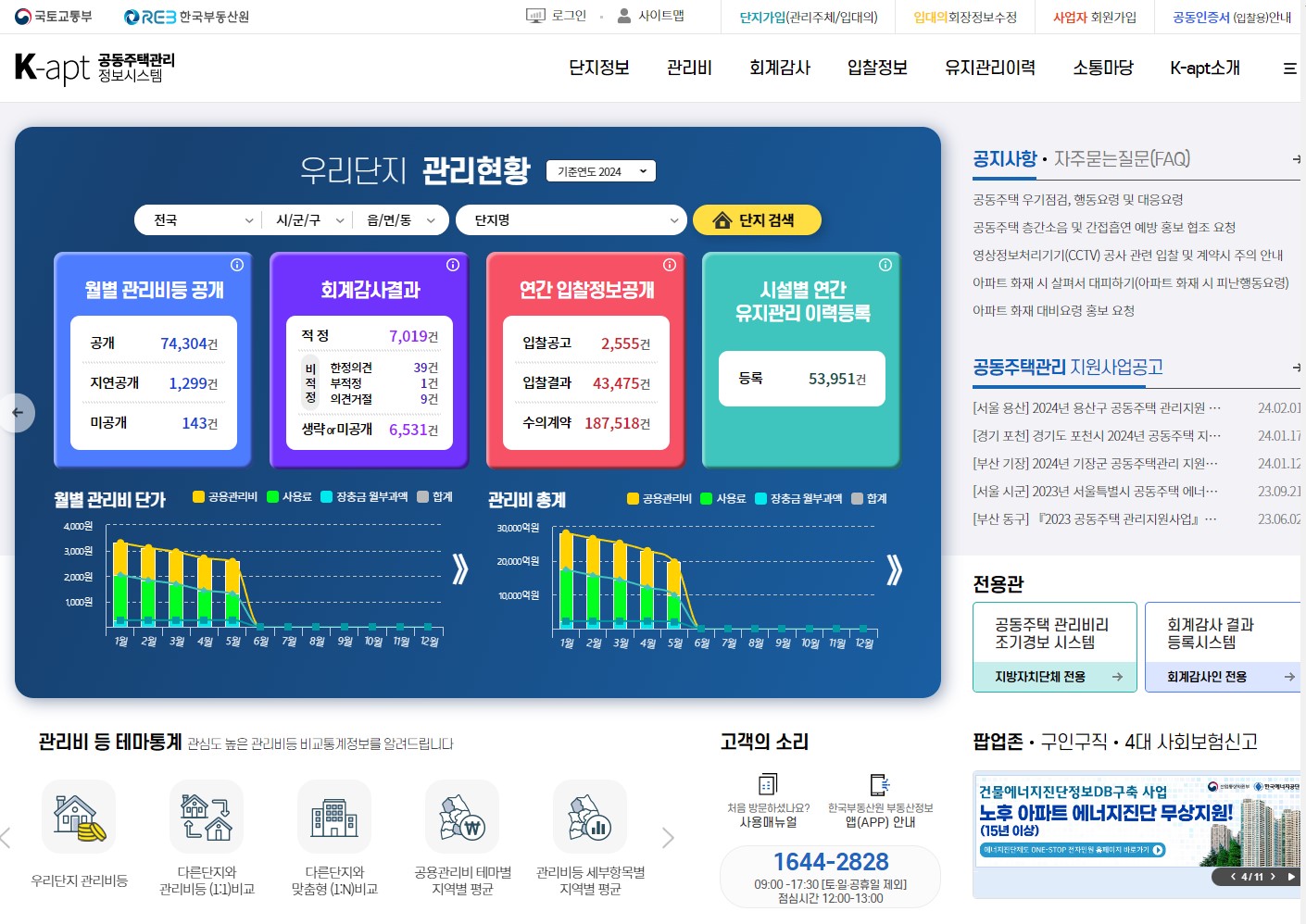 - 통계 제공: 다양한 관리비 통계, 단지현황, 전자입찰 통계, 회계감사보고서 통계를 제공합니다.