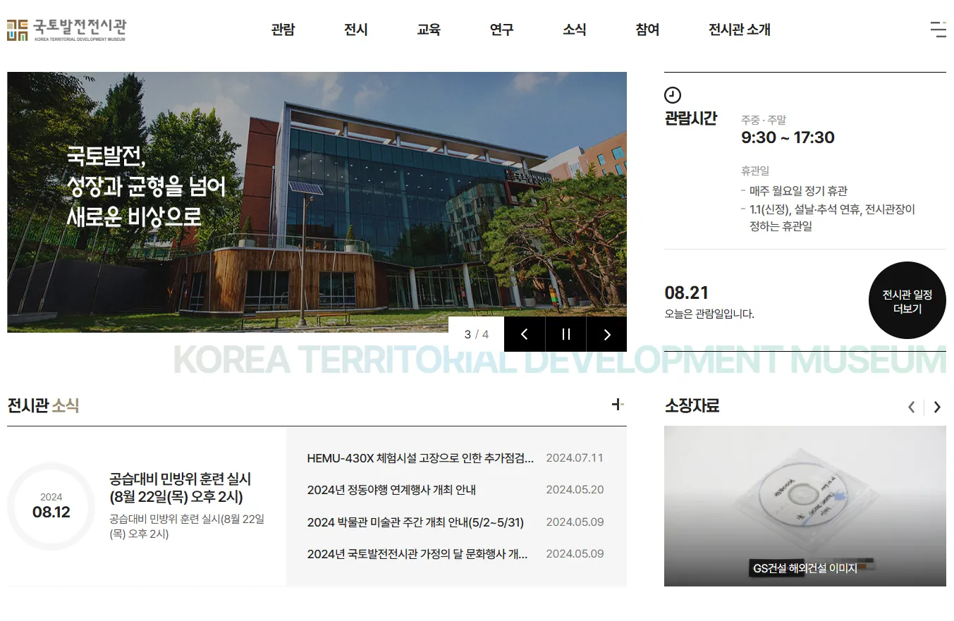 - 전시관 정보 제공: 국토발전전시관의 기본 정보와 상설전시 안내, 사이버 투어 등 다양한 전시 정보를 국민들에게 제공합니다.