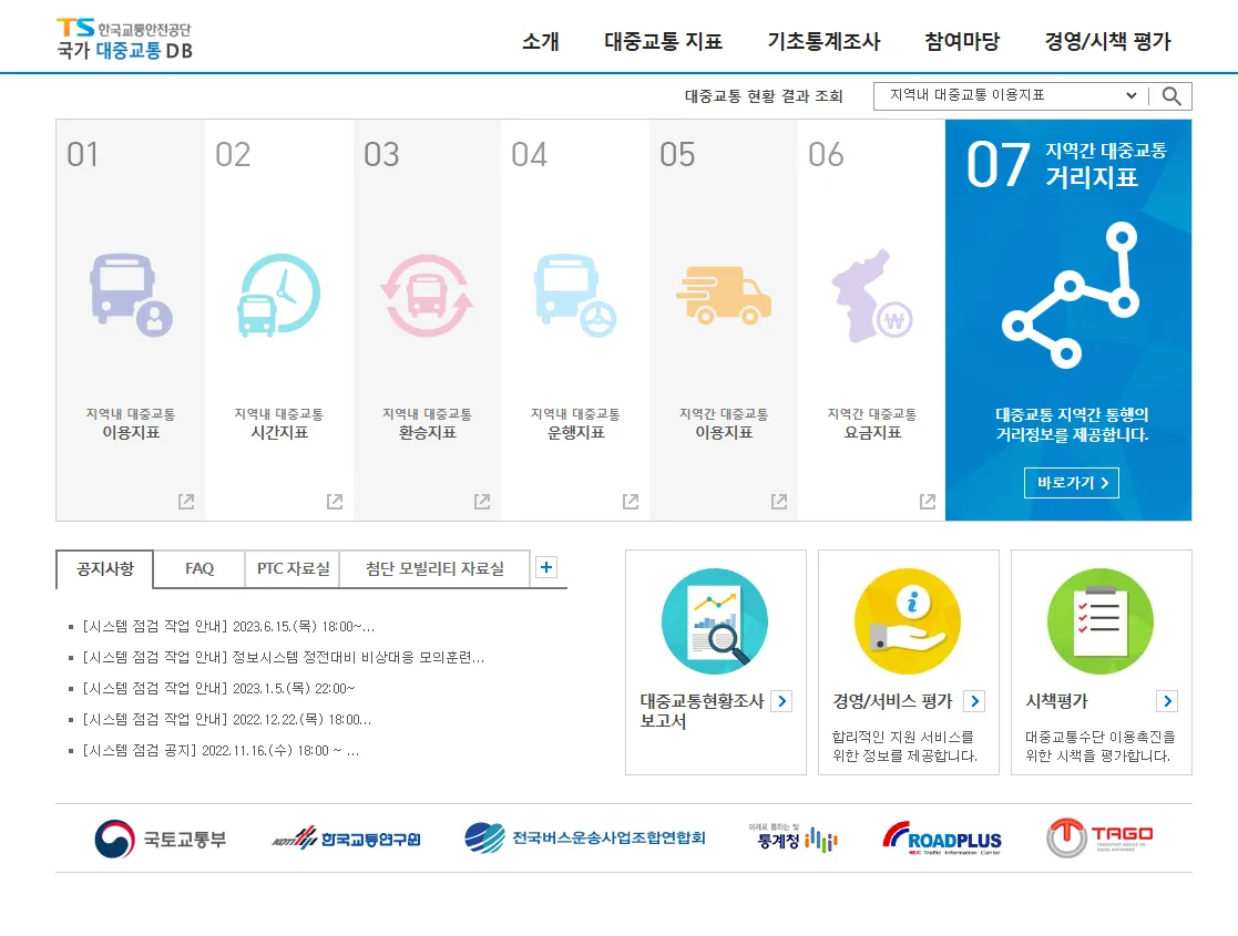 - 통계 및 분석자료: 대중교통 이용 현황, 경영 평가 및 시책에 관한 통계적 자료 제공