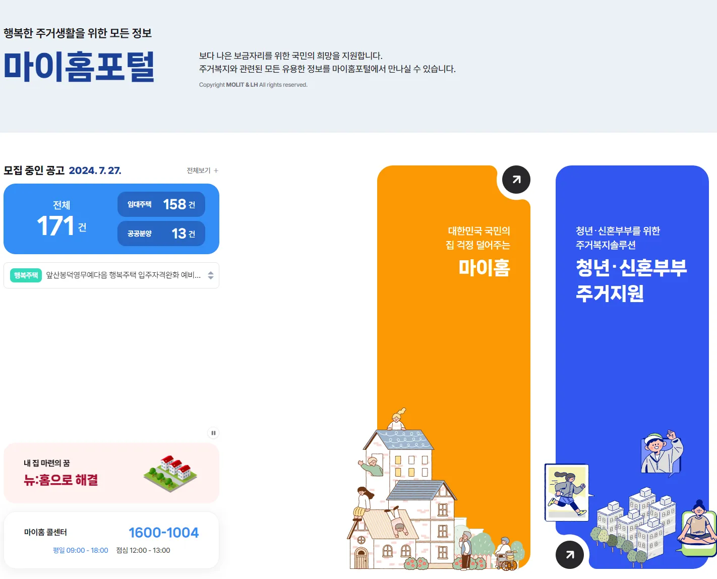 마이홈포털은 임대주택, 주거급여, 주택금융 등 다양한 주거복지 정보를 통합 제공하기 위해 구축되었습니다.