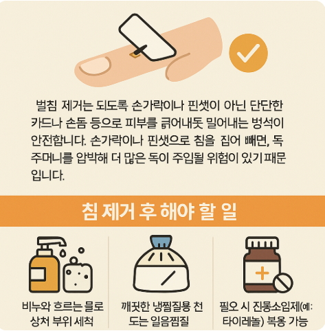 손가락이나 핀셋으로 침을 집어 빼면, 독주머니를 압박해 더 많은 독이 주입될 위험이 있기 때문입니다.