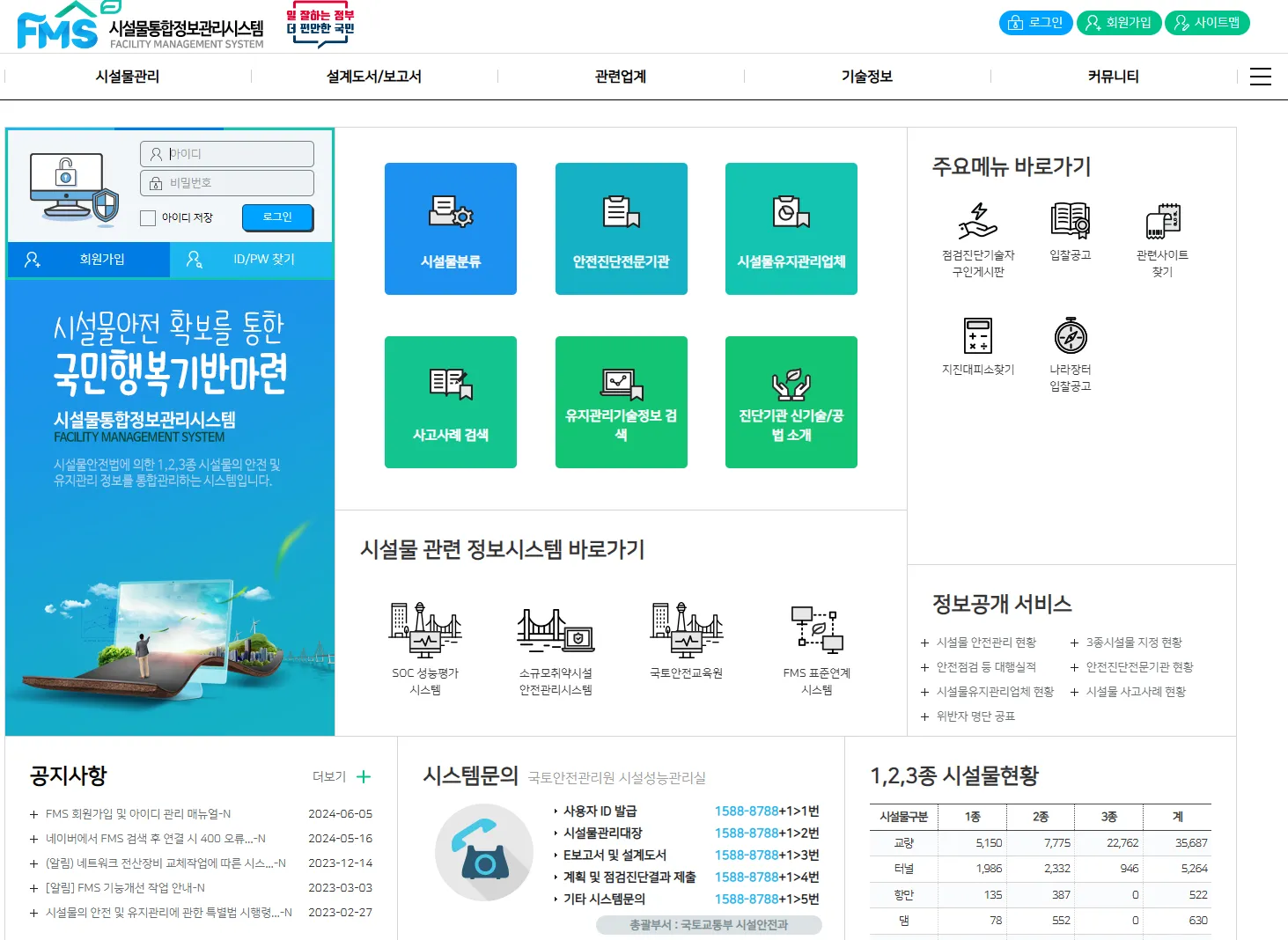 시설물통합정보관리시스템(FMS)은 2019년에 구축된 시스템으로, 시설물의 안전과 유지관리 관련 자료 및 정보체계를 구축하고자 하는 목적을 가지고 있습니다. 이 시스템은 국가 주요시설물의 현황을 관리하고, 점검·진단 결과와 보수·보강 이력 등을 종합적으로 관리함으로써 시설물의 안전성을 높이고 유지관리에 필요한 정보를 체계적으로 제공합니다.