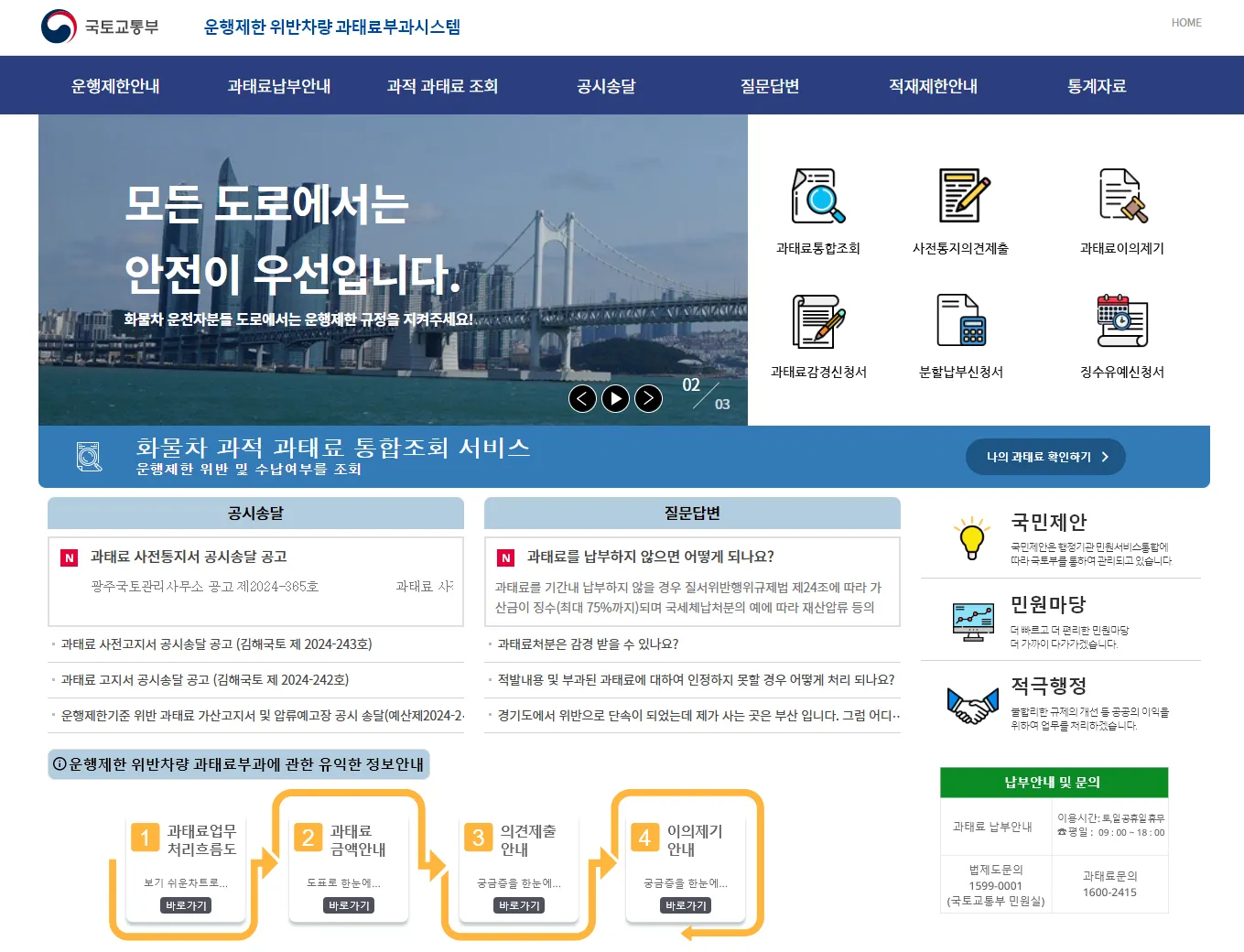 - 과태료 통합 조회 및 공시송달 게시 등의 기능을 통해 관련 정보를 투명하게 공개합니다.