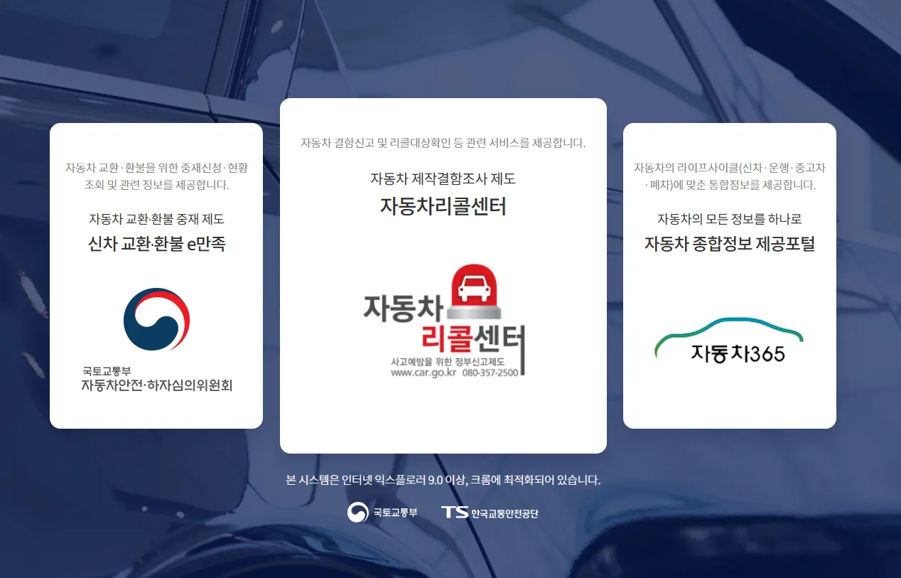 이 시스템은 국민들이 안전하게 자동차를 이용할 수 있도록 결함 정보 수집부터 리콜 이행까지의 모든 과정을 통합 관리합니다.