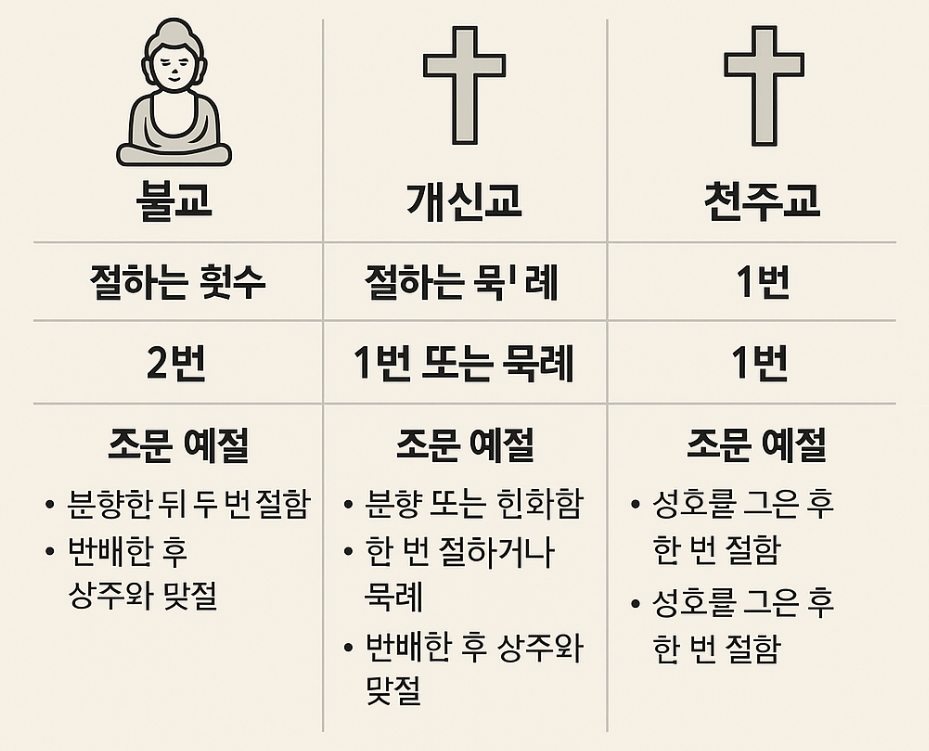 - 지나치게 특정 종교 방식을 고집하지 않고, 유가족 중심으로 행동하는 게 예의입니다.