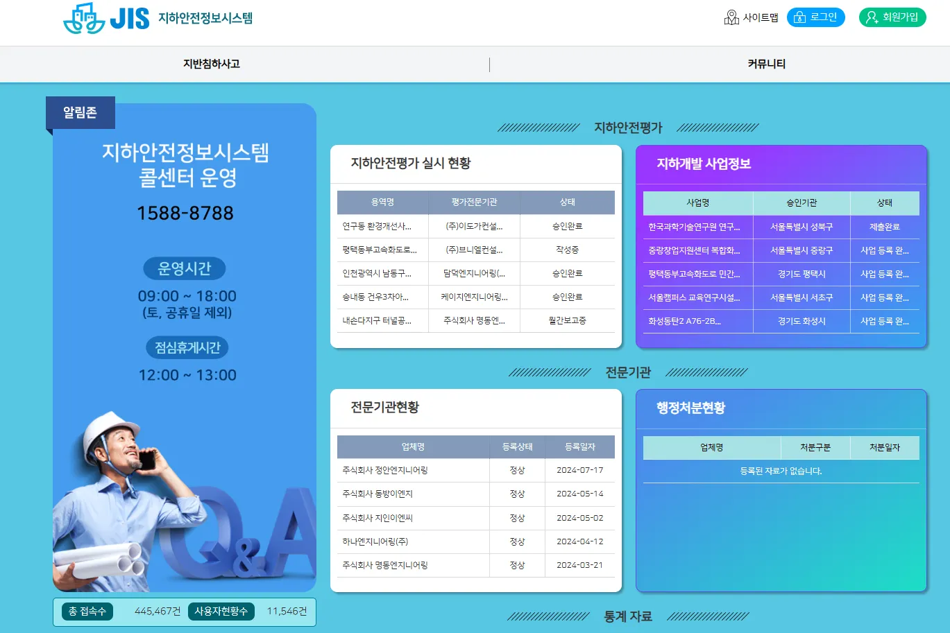 - 통계: 지하시설물 현황, 지반침하 발생 현황, 전문기관 현황 등