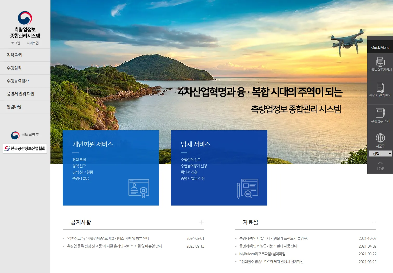 - 증명서/확인서 발급 서비스: 측량업 등록 현황 확인서, 실적 확인서, 사업수행 평가 확인서, 기술자 경력증명서, 기술자 보유증명서 등 다양한 증명서를 발급합니다.