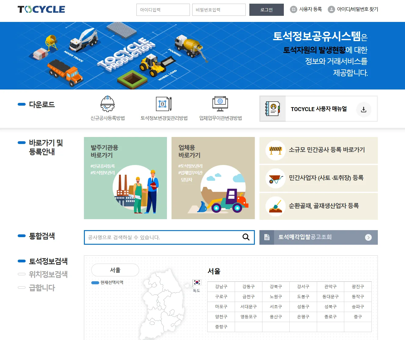- 개방 데이터: 공사현장 토석정보, 사토장, 토취장, 골재업체 리스트