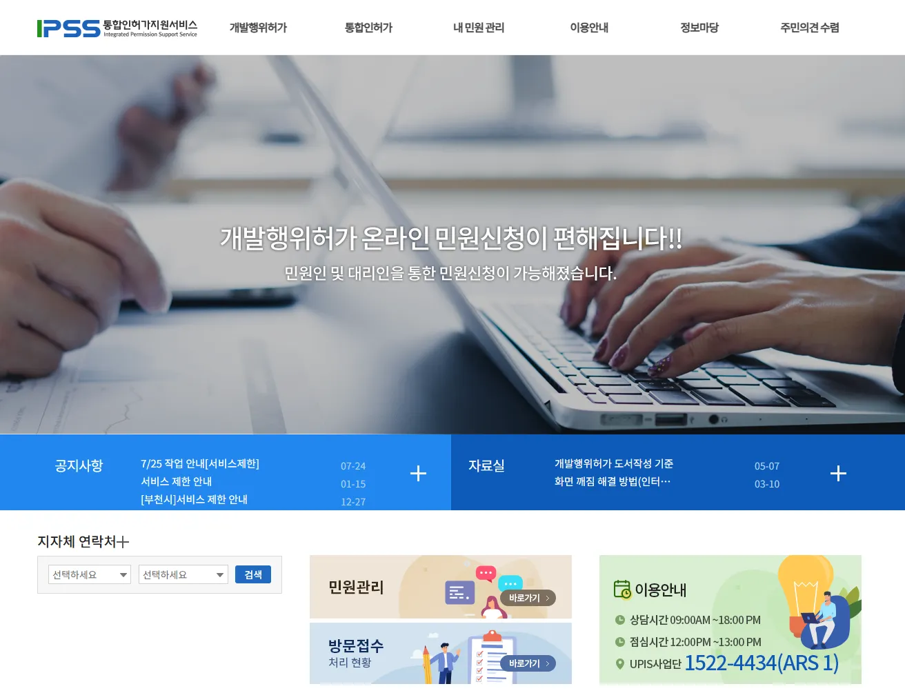 통합인허가지원시스템(IPSS)은 건축, 개발행위, 공장설립 등의 토지이용 인허가 민원을 하나의 시스템에서 통합 관리하여 민원 처리의 효율성을 높이고, 국민들에게 편리한 서비스를 제공하는 데 중점을 둔 시스템입니다.