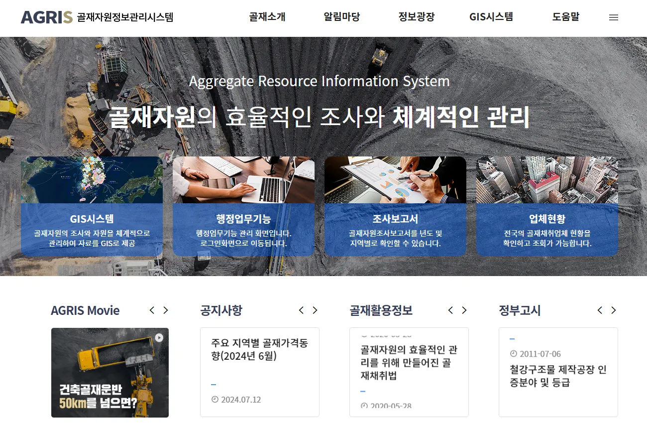 골재자원정보관리시스템(AGRIS) 소개: 주소, 기능, 보유자료 등