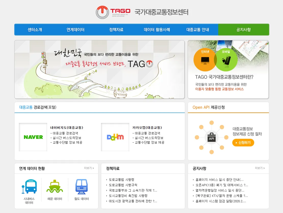 - 국가대중교통정보센터를 통해 대중교통 정보의 이용 현황을 분석합니다. 이를 통해 Open-API와 민간 활용 등의 통계 자료를 제공합니다.