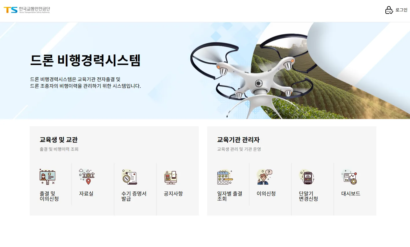 드론비행경력시스템은 한국교통안전공단이 드론 교육기관의 교관 및 교육생의 전자 출결 관리를 위해 구축한 시스템입니다. 이 시스템은 비콘(Beacon) 기술을 활용하여 교관과 교육생의 입퇴실 시간을 전자적으로 기록하며, 교육기관의 효율적인 관리와 교관 및 교육생의 비행 경력 데이터를 체계적으로 관리하는 데 목적을 두고 있습니다. 이를 통해 드론 교육의 효율성을 높이고, 비행 경력을 체계적으로 관리함으로써 드론 산업의 발전에 기여합니다.