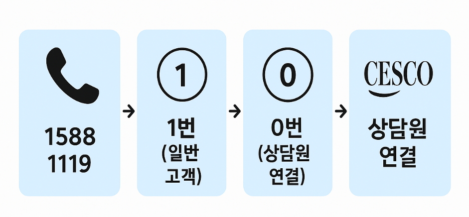 1588-1119 → 1번(일반 고객) → 0번(상담원 연결)