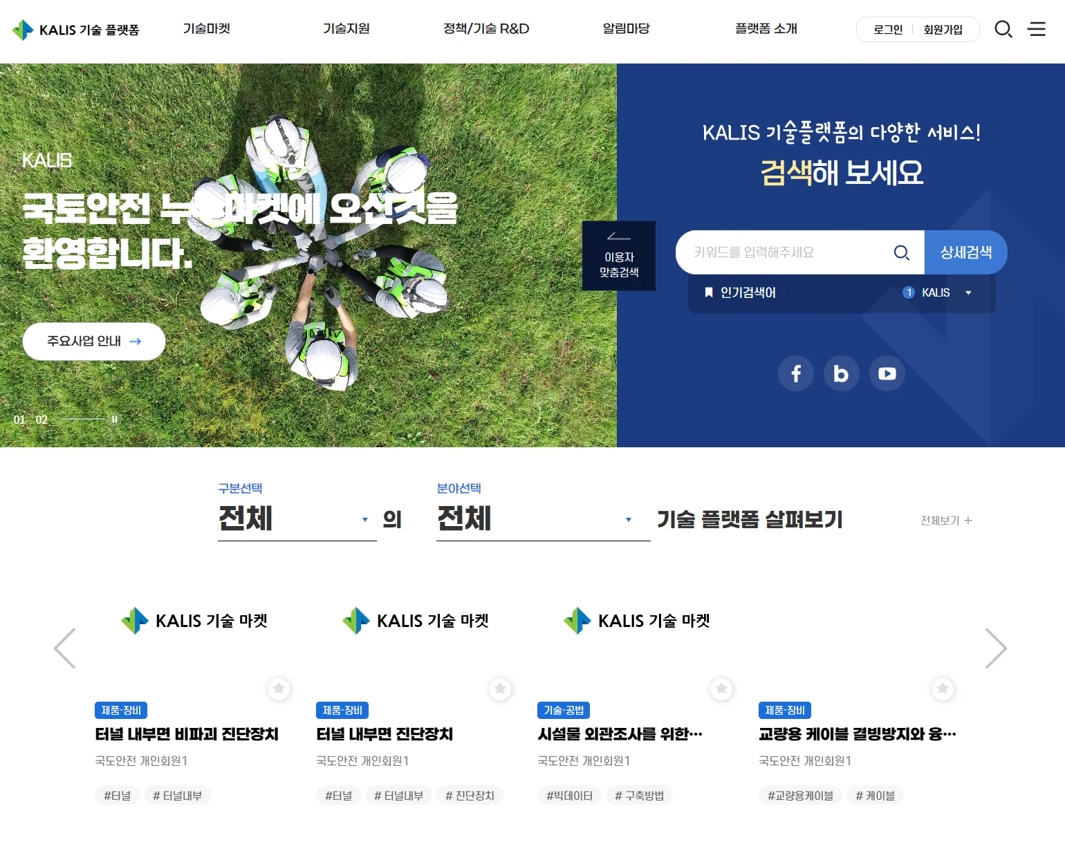 KALIS 기술마켓 홈페이지는 안전산업 분야에서 민간기업의 기술 역량을 강화하고 동반 성장을 지원하기 위해 국토안전관리원에서 운영하는 플랫폼입니다. 2021년에 구축된 이 시스템은 안전산업 분야의 혁신을 촉진하고 기업들의 기술적, 경제적 도전을 지원하기 위해 다양한 기능과 정보를 제공하고 있습니다.